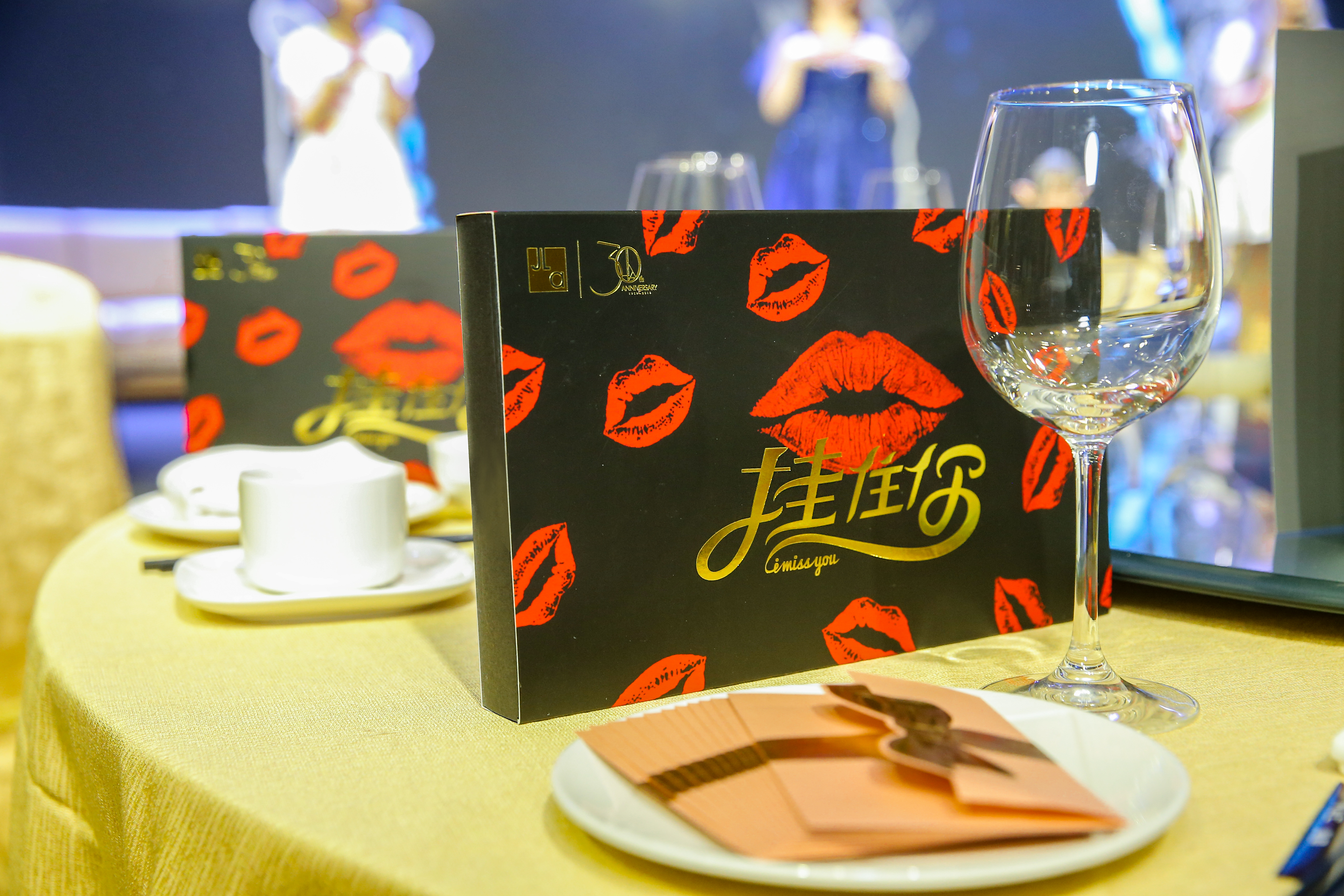 與往年不同,這次場地換了橫向的擺桌和舞臺搭建。桌上帽子戲法樣的布置更神祕。壹盒非常精美,熱烈有趣的巧克力上面,還寫著壹句非常甜蜜的 “掛住妳” 。